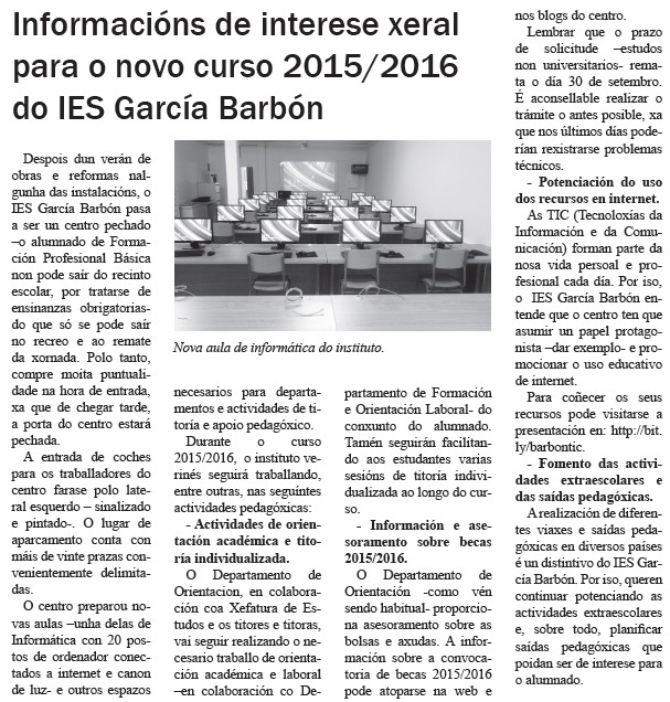 Información de interese xeral para o curso 2015/2016 no IES García Barbón 14 de septiembre de 2015 - 21:51 - I.E.S. GARCÍA BARBÓN Facebook Twitter Whatsapp Email
